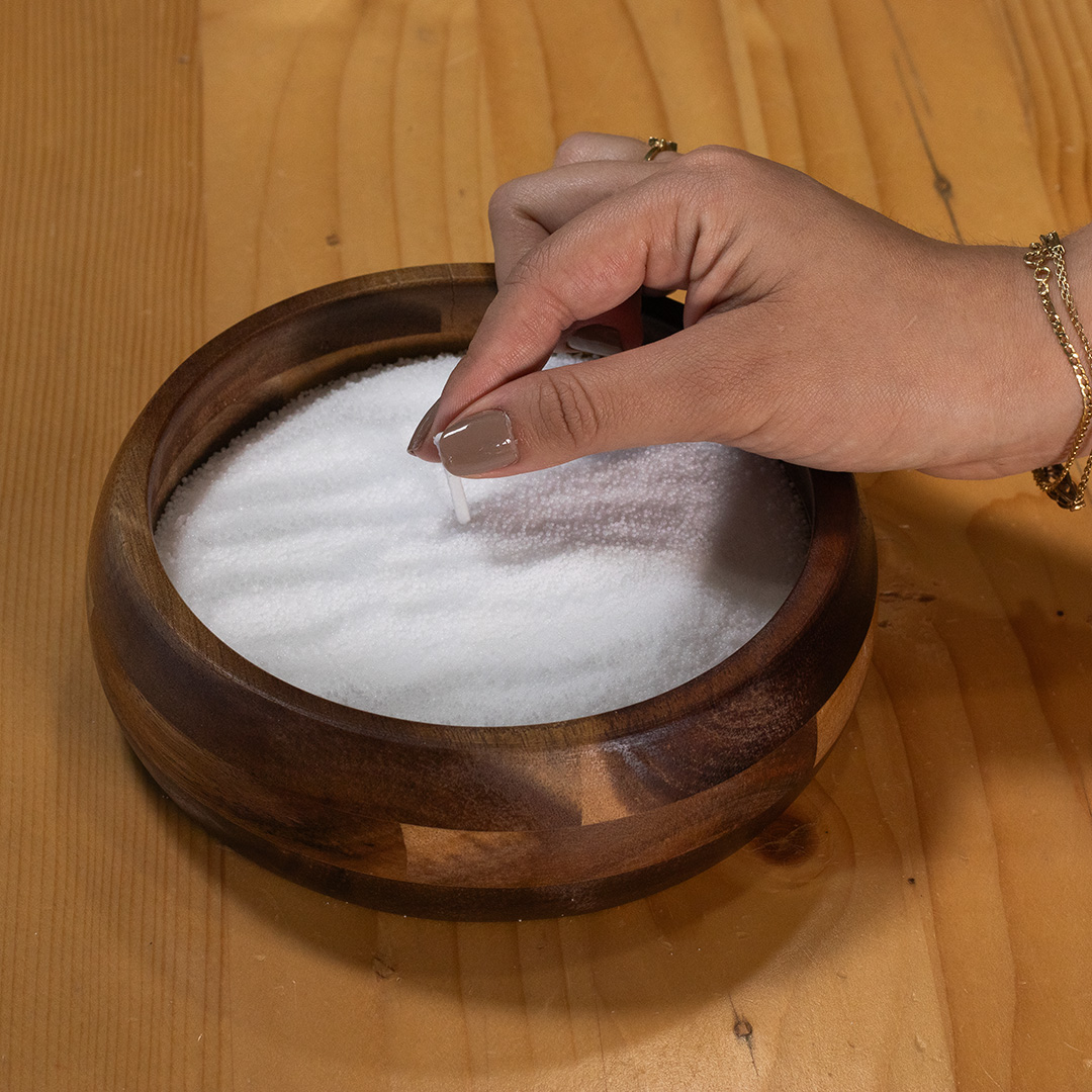 Recuerda: cuando las perlas se solidifican, puedes triturarlas con la mano y colocarlas en la parte inferior para reutilizarlas. ¡Así aprovechas cada parte de la vela!